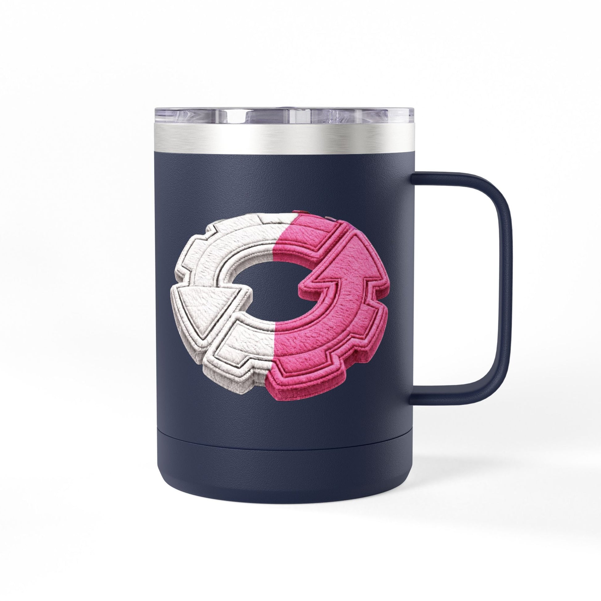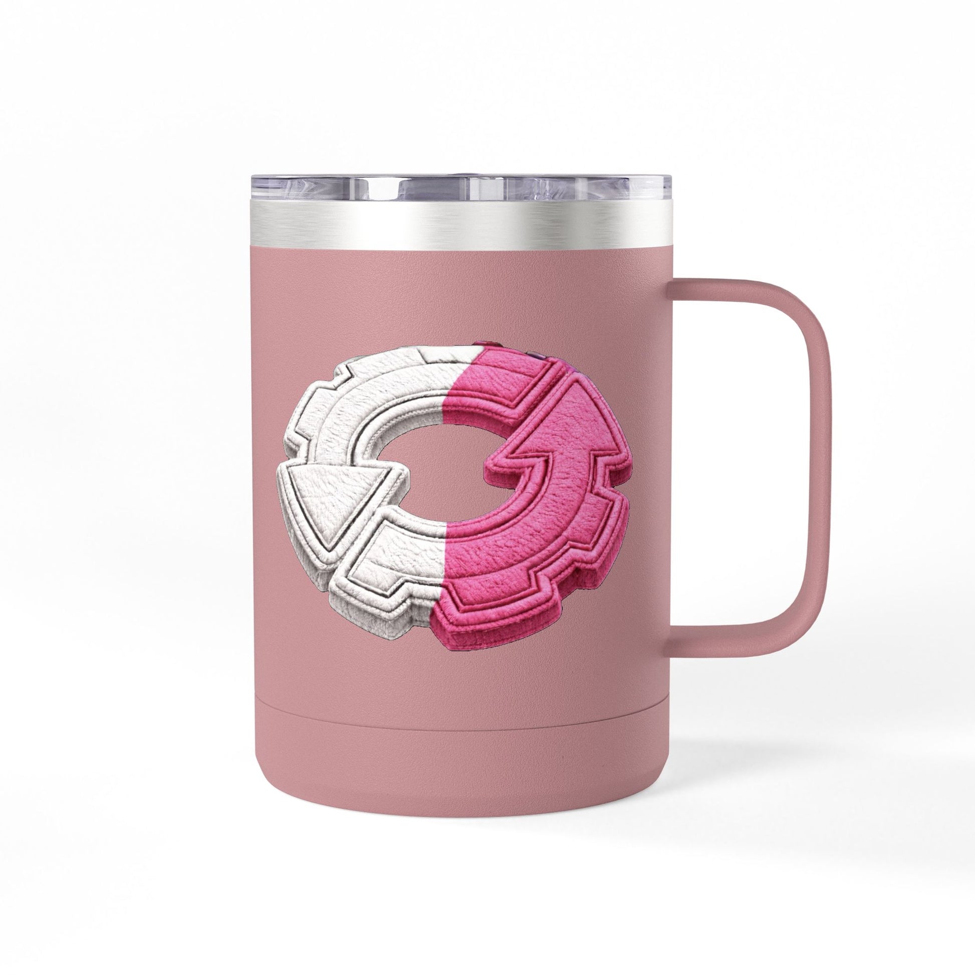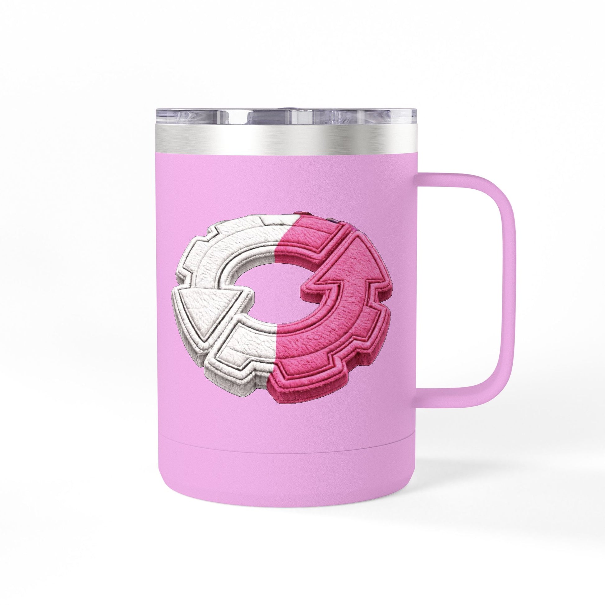 This 15oz stainless steel tumbler brings a playful, tactile energy to your daily coffee or tea ritual. The powder-coated white body showcases a raised, embroidered-style circular emblem in split pink and white — a bold, graphic mark that feels modern and a little nostalgic at once. Double-wall insulation keeps your drink hot or cold for hours, while the ergonomic handle and leak-proof lid make it easy to carry between commuter trains, home office desks, and weekend walks. The glossy print and clean finish give it a polished look that complements a minimalist shelf or a color-forward mug collection. It’s made to be used every day, hold up to travel, and add a little personality to routine moments.