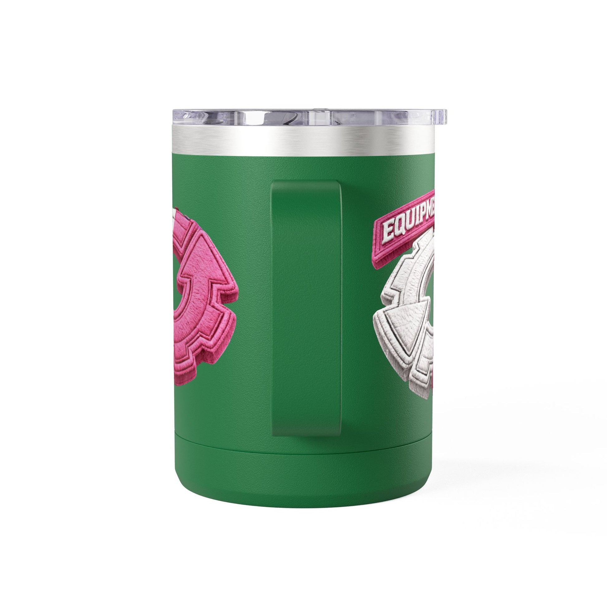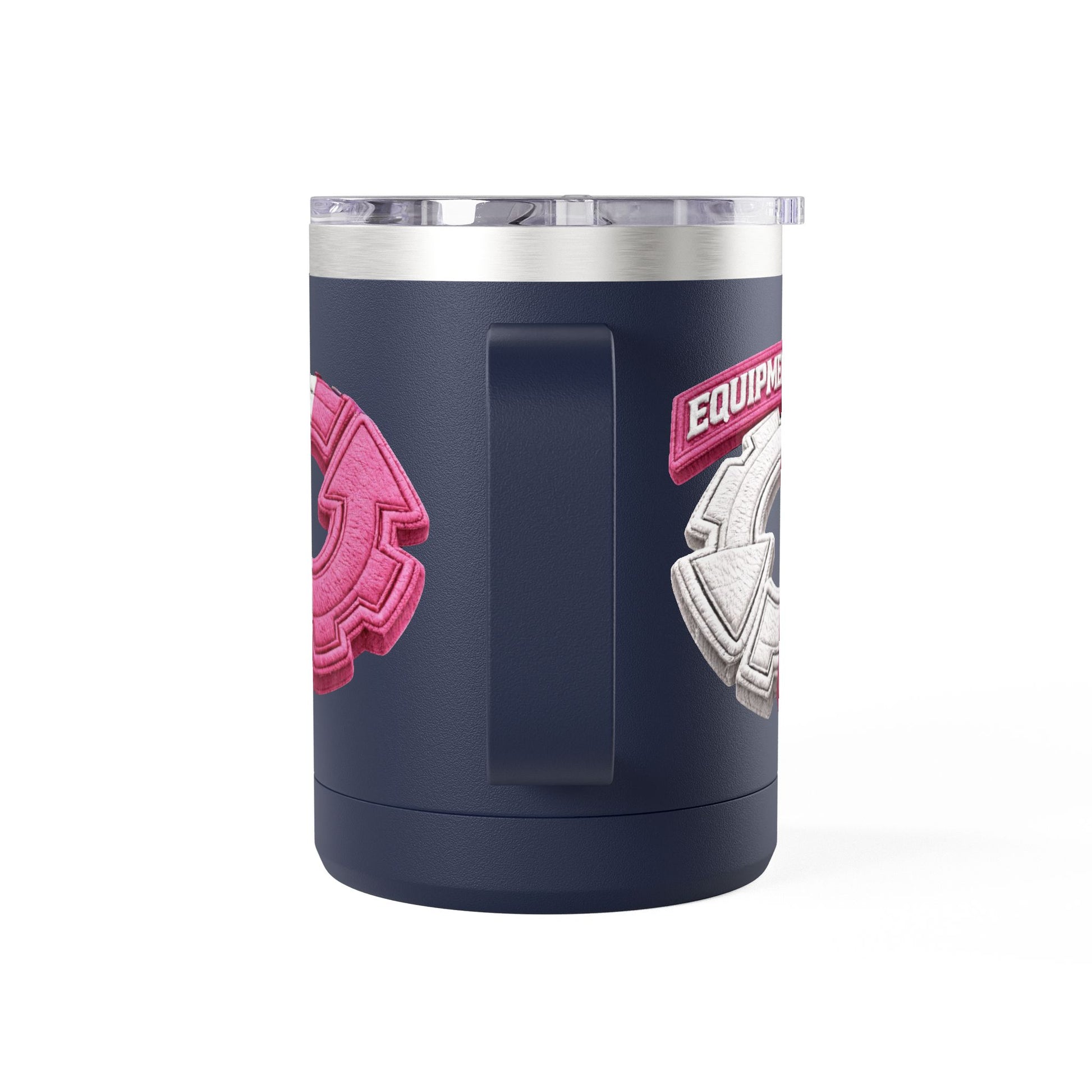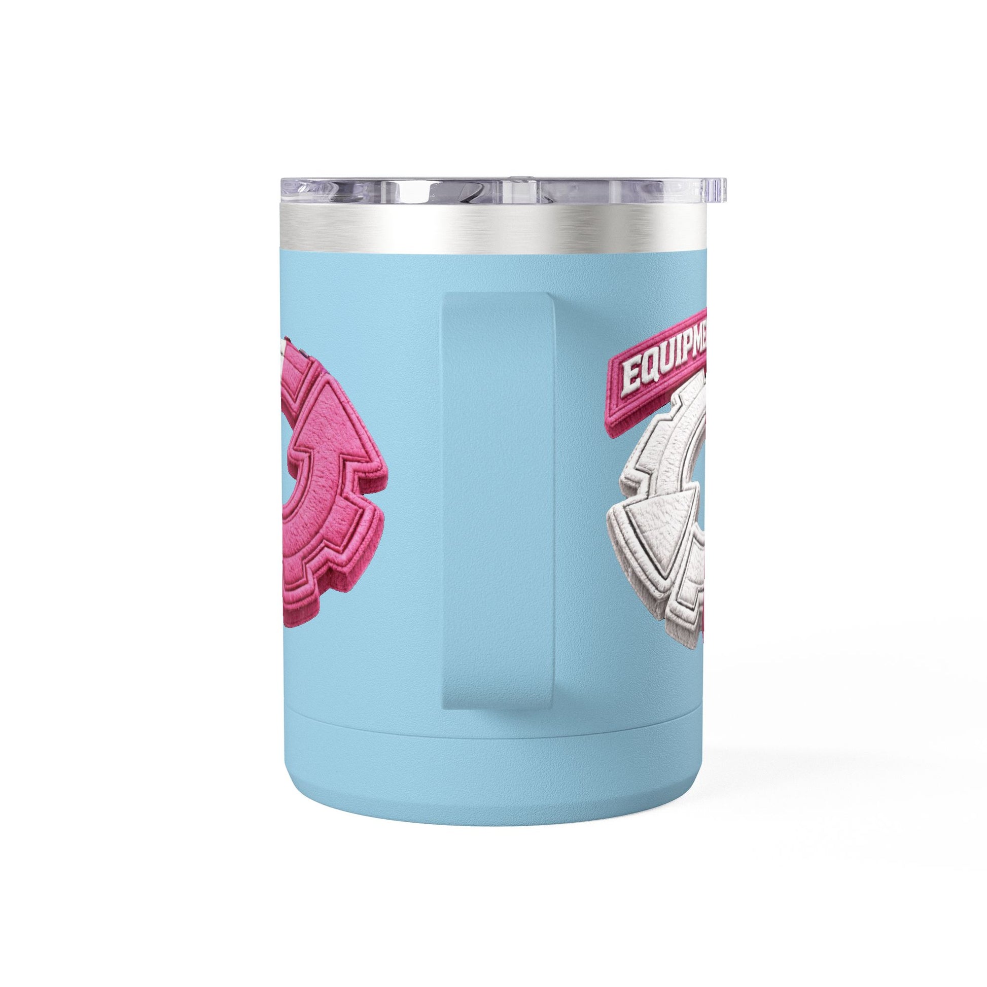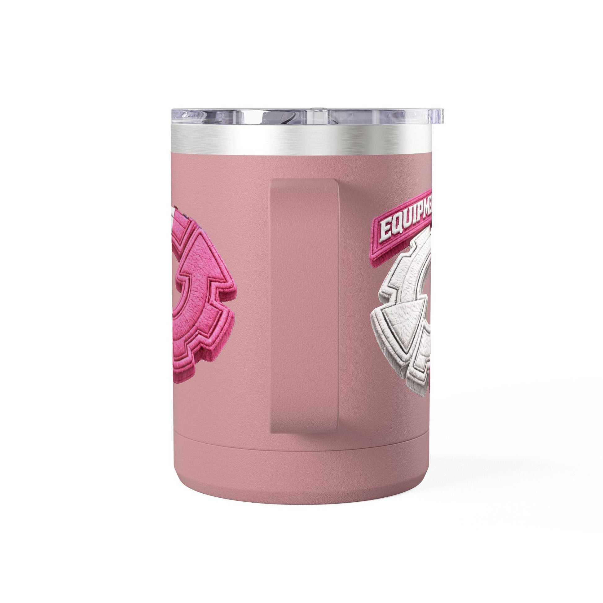 This 15oz stainless steel tumbler brings a playful, tactile energy to your daily coffee or tea ritual. The powder-coated white body showcases a raised, embroidered-style circular emblem in split pink and white — a bold, graphic mark that feels modern and a little nostalgic at once. Double-wall insulation keeps your drink hot or cold for hours, while the ergonomic handle and leak-proof lid make it easy to carry between commuter trains, home office desks, and weekend walks. The glossy print and clean finish give it a polished look that complements a minimalist shelf or a color-forward mug collection. It’s made to be used every day, hold up to travel, and add a little personality to routine moments.