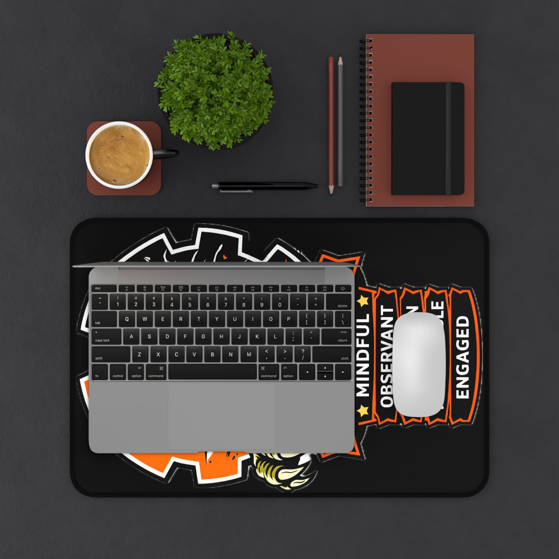 Bring bold energy to your workspace with this neoprene desk mat featuring a fierce T-rex breaking through a cog emblem. Deep blacks and vivid orange accents make the design pop while the crisp printing holds every tooth and scale in sharp detail. The soft, smooth surface supports typing, writing, and crafting, while the reinforced hemmed edges and anti-slip backing keep the mat steady and long-lasting. Place it under a keyboard, sketchbook, or tools to add grit and personality to work sessions, drills, or gaming marathons.