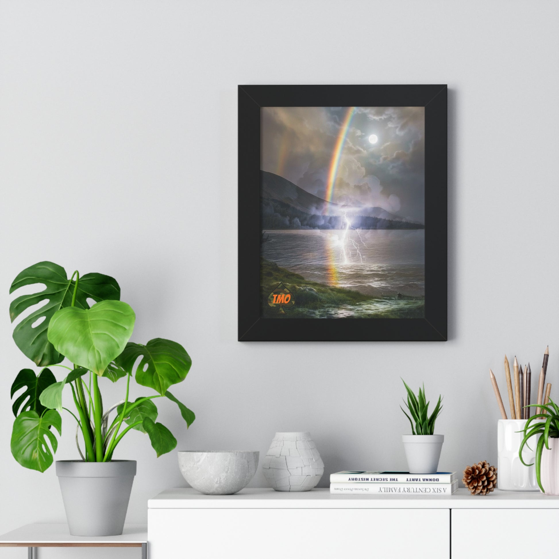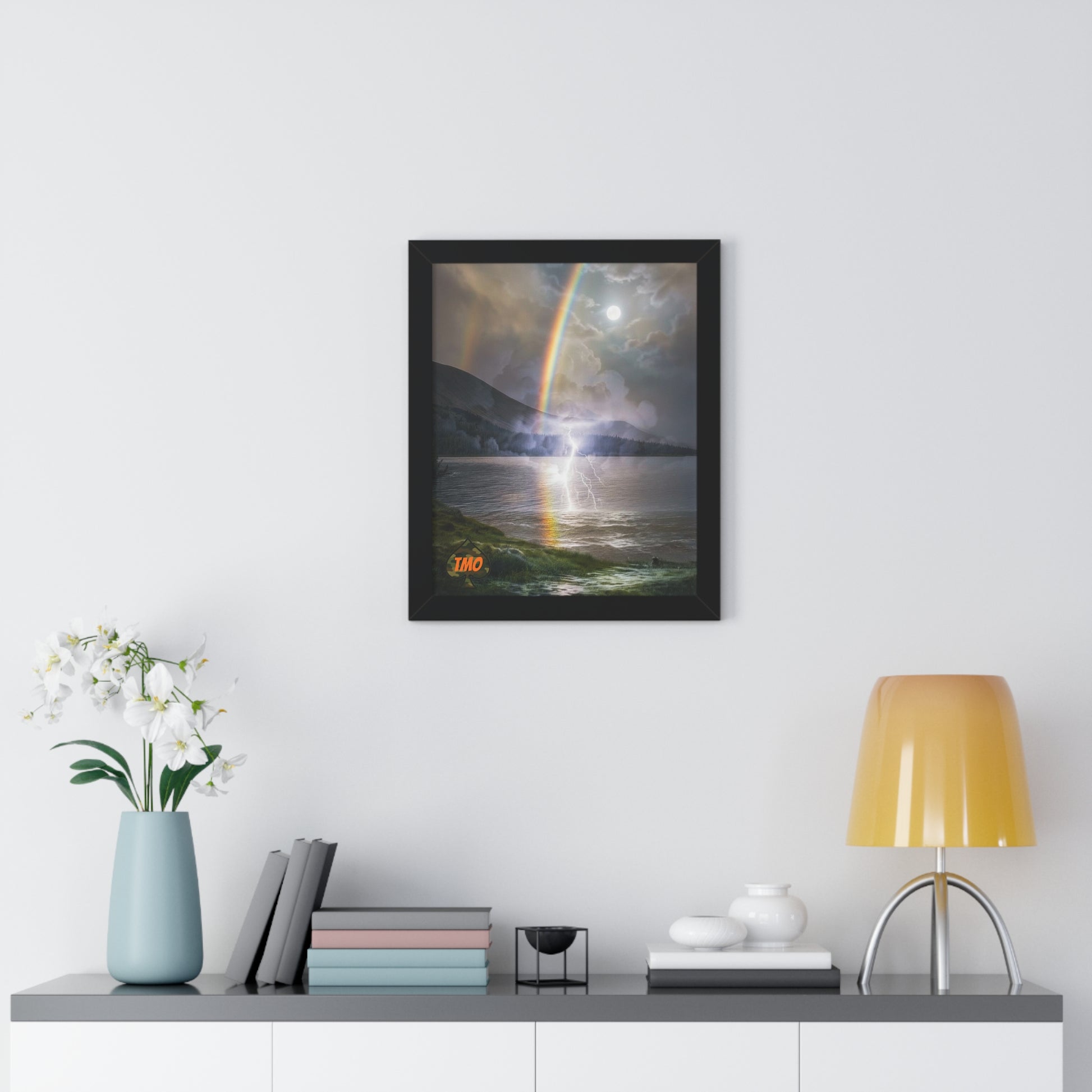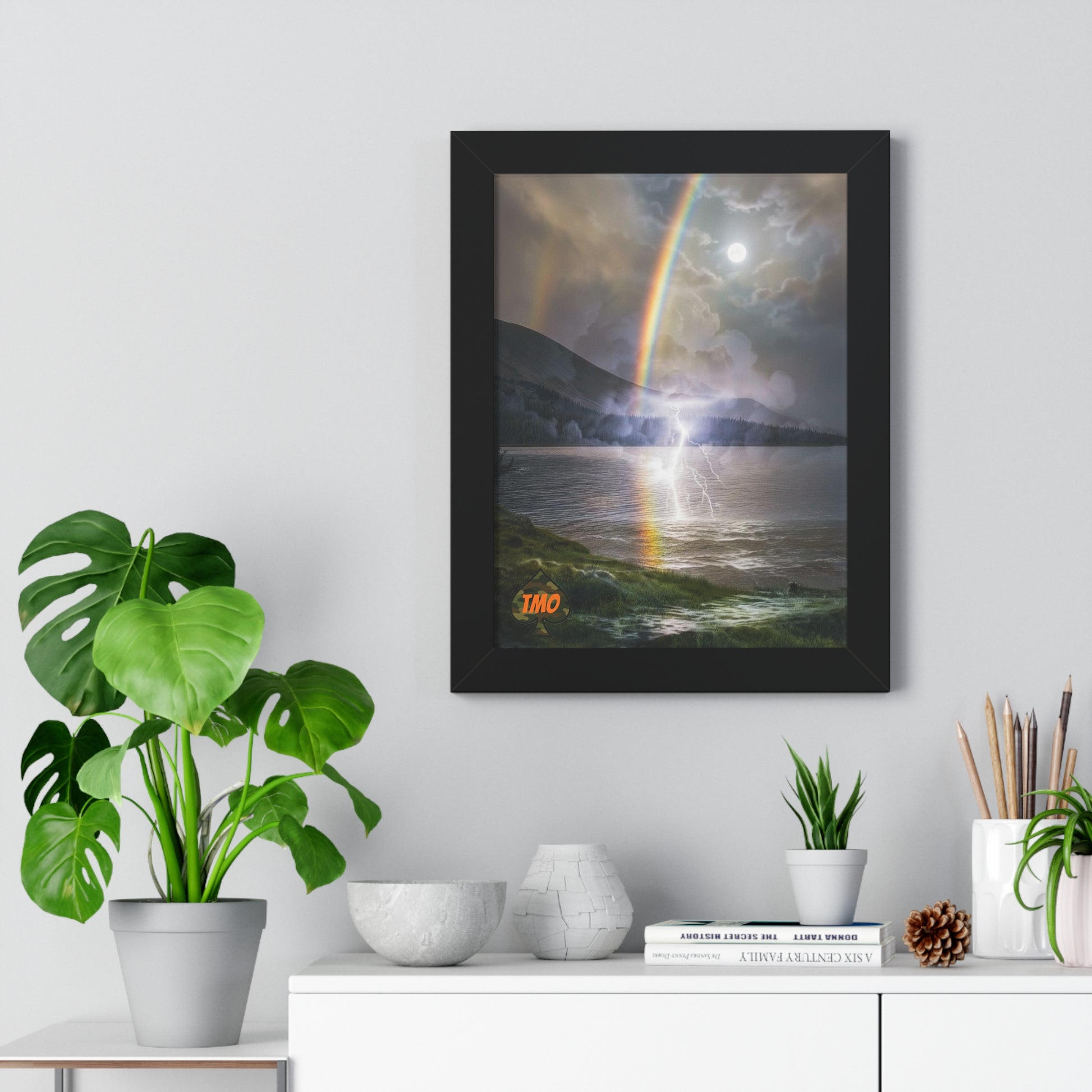 Bring raw power and beauty into your space with this framed nature poster. Featuring a dramatic scene of a rainbow striking down through storm clouds as lightning cracks across a lake, this artwork captures the balance between chaos and calm.