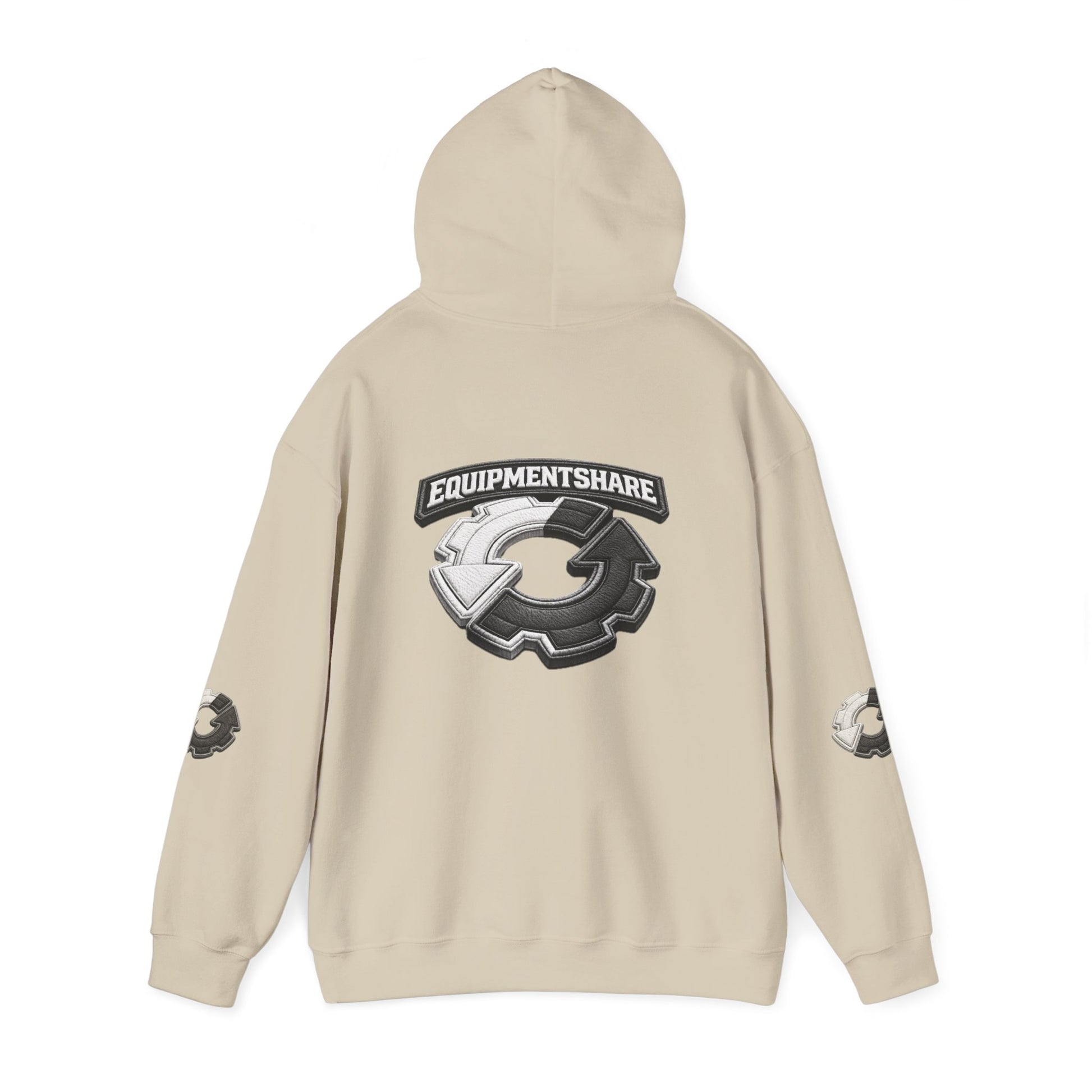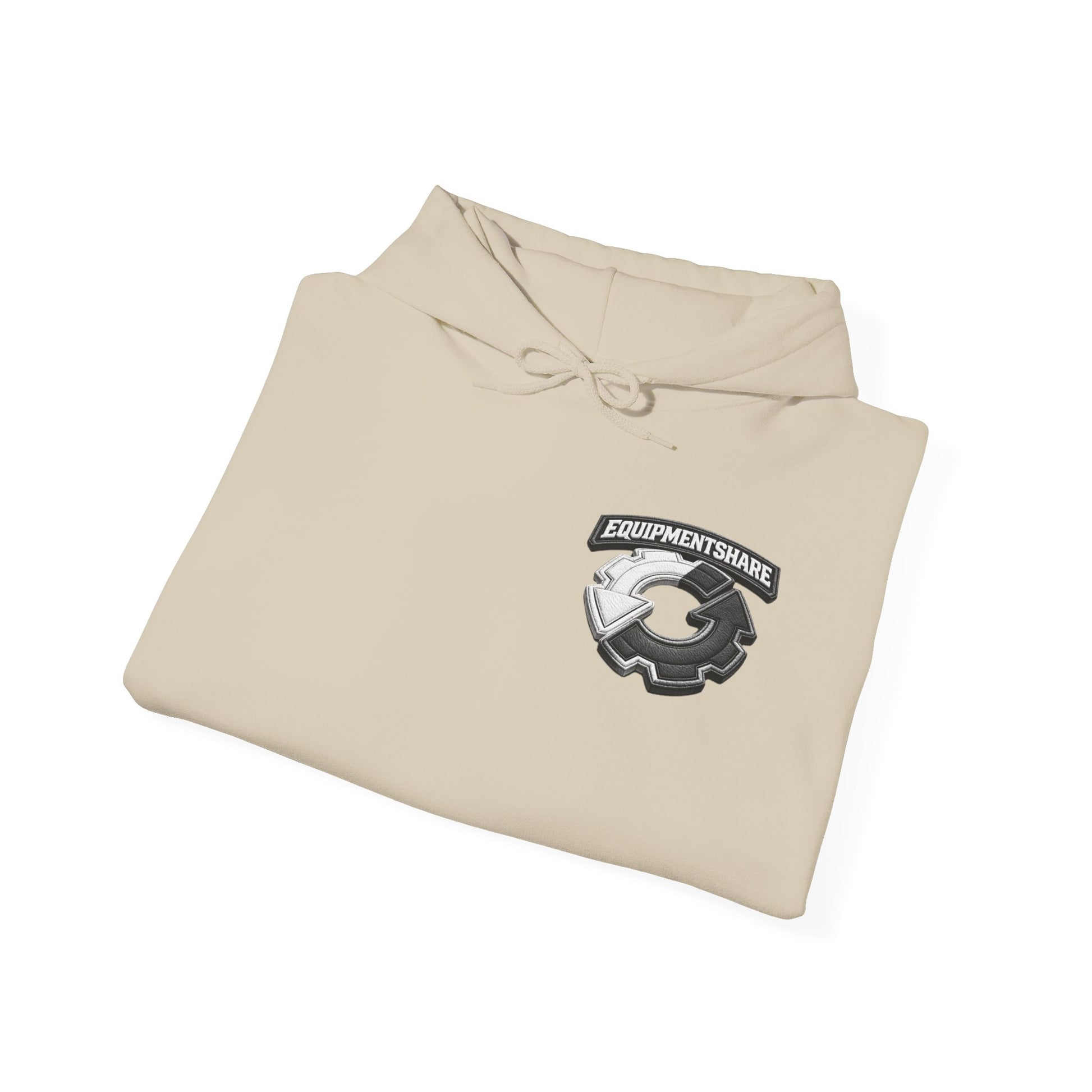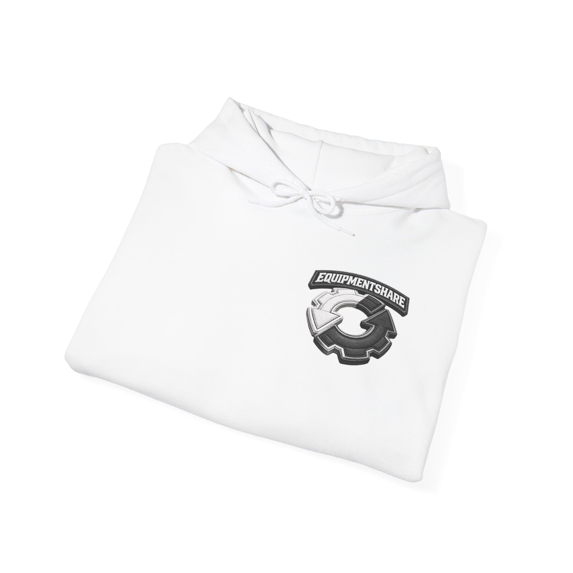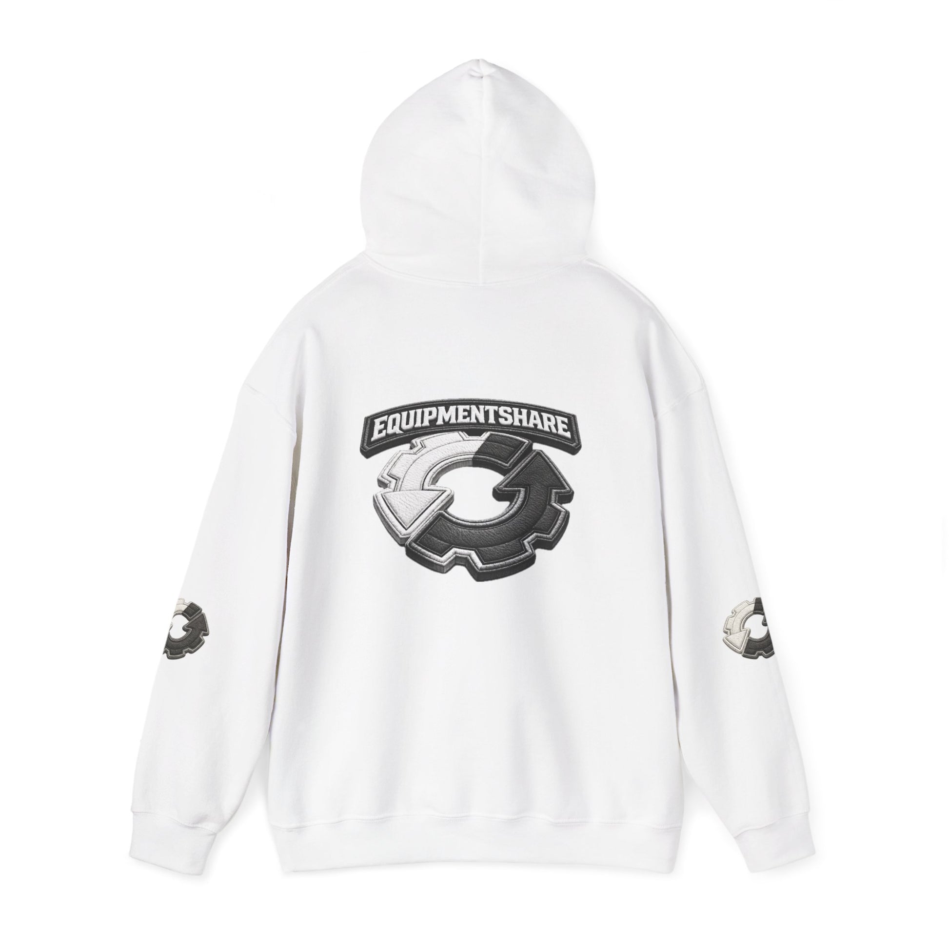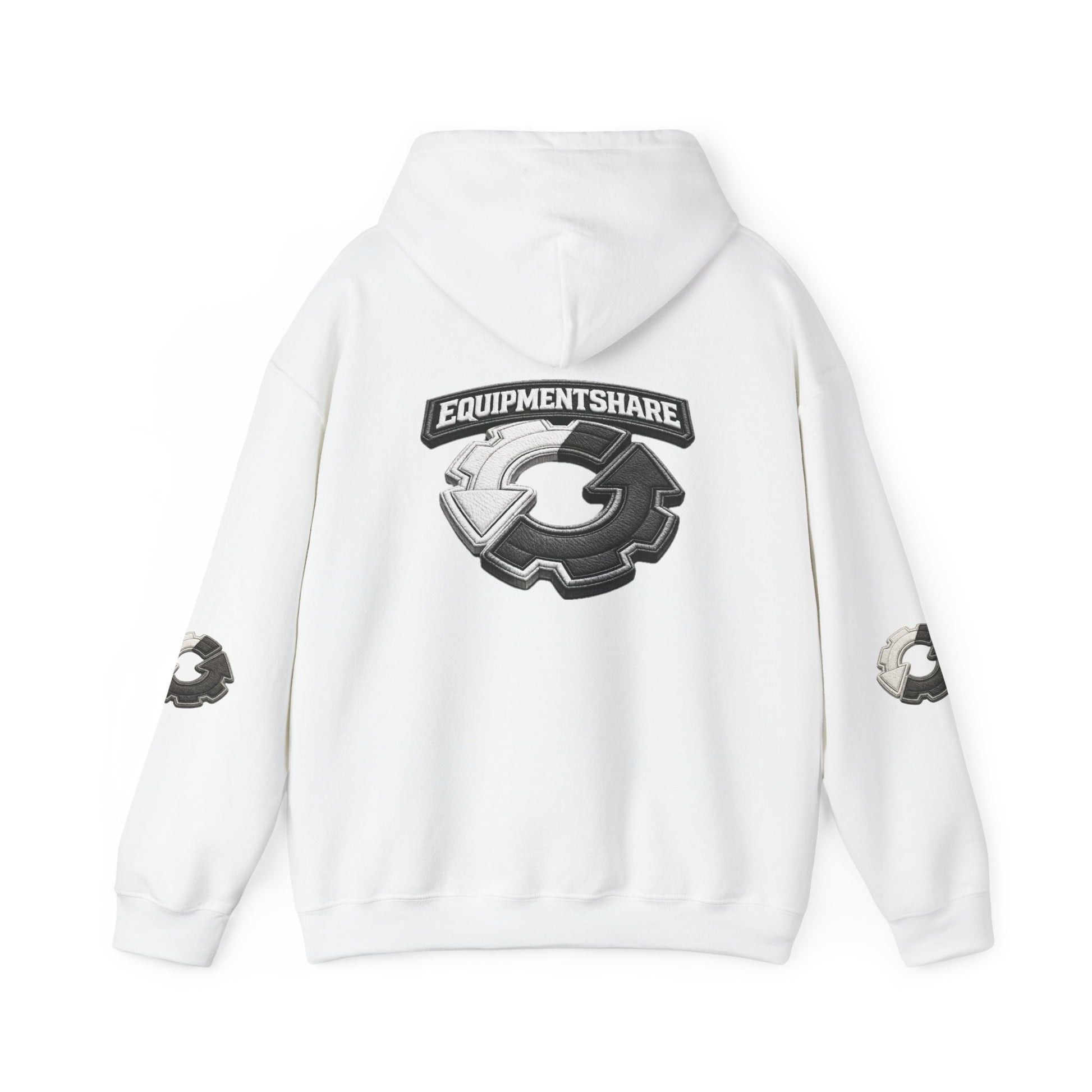 A soft, midweight hoodie made to be worn during long workdays, weekend projects, and early-morning meetups. Clean white fabric carries a bold monochrome gear-and-arrow badge on the chest and a larger emblem across the back — subtle branding that reads as utility and crew identity rather than loud fashion. Matching sleeve emblems add balance and a workshop-ready feel. The roomy kangaroo pocket and double-layer hood with color-matched drawcord make this piece practical and comfortable. Durable 50/50 cotton-poly construction holds prints and embroidery well, so the graphics keep their crisp edges through wear and washes. Wear it to the job site, the maker space, or while hauling gear — it settles into a hardworking routine and feels like part of the team.