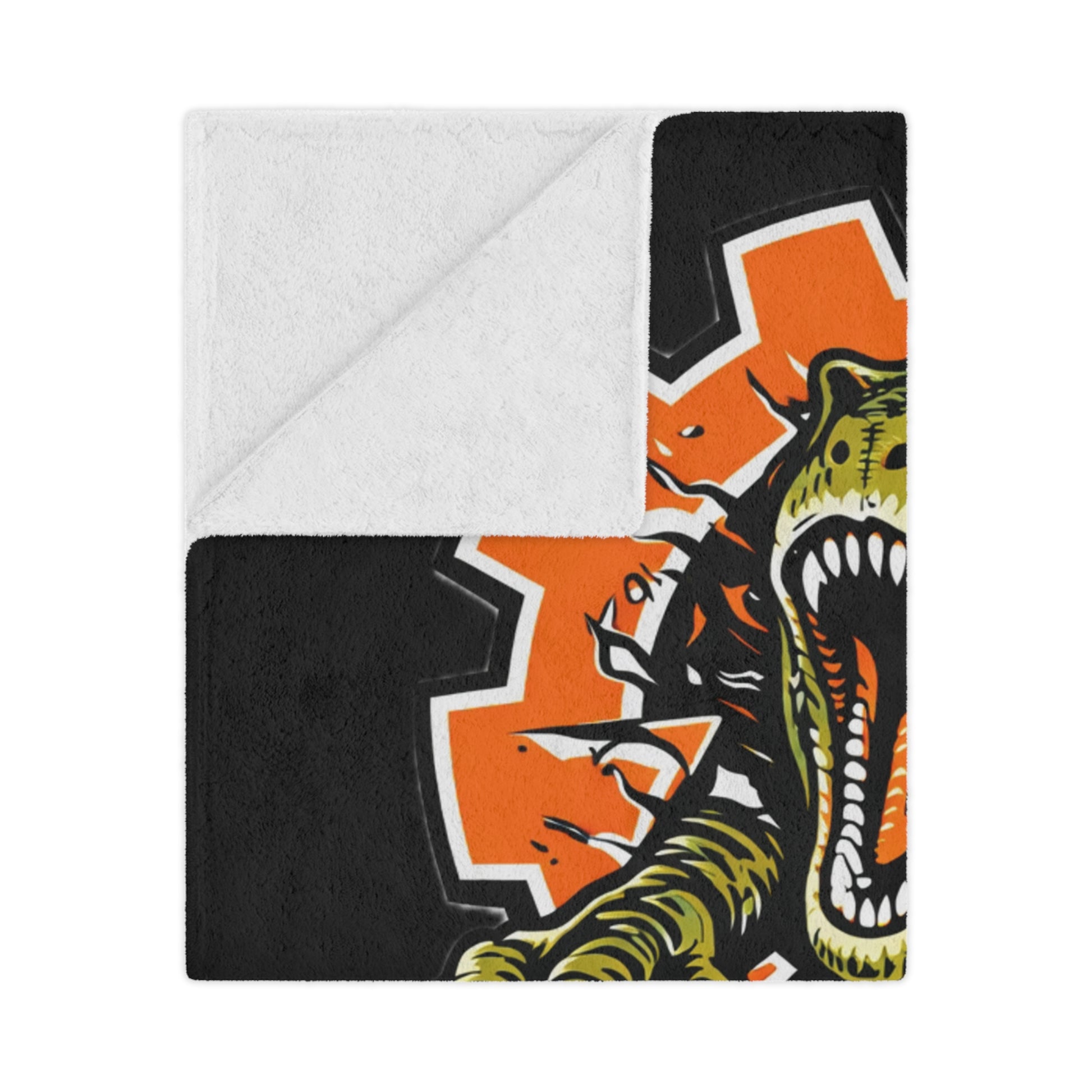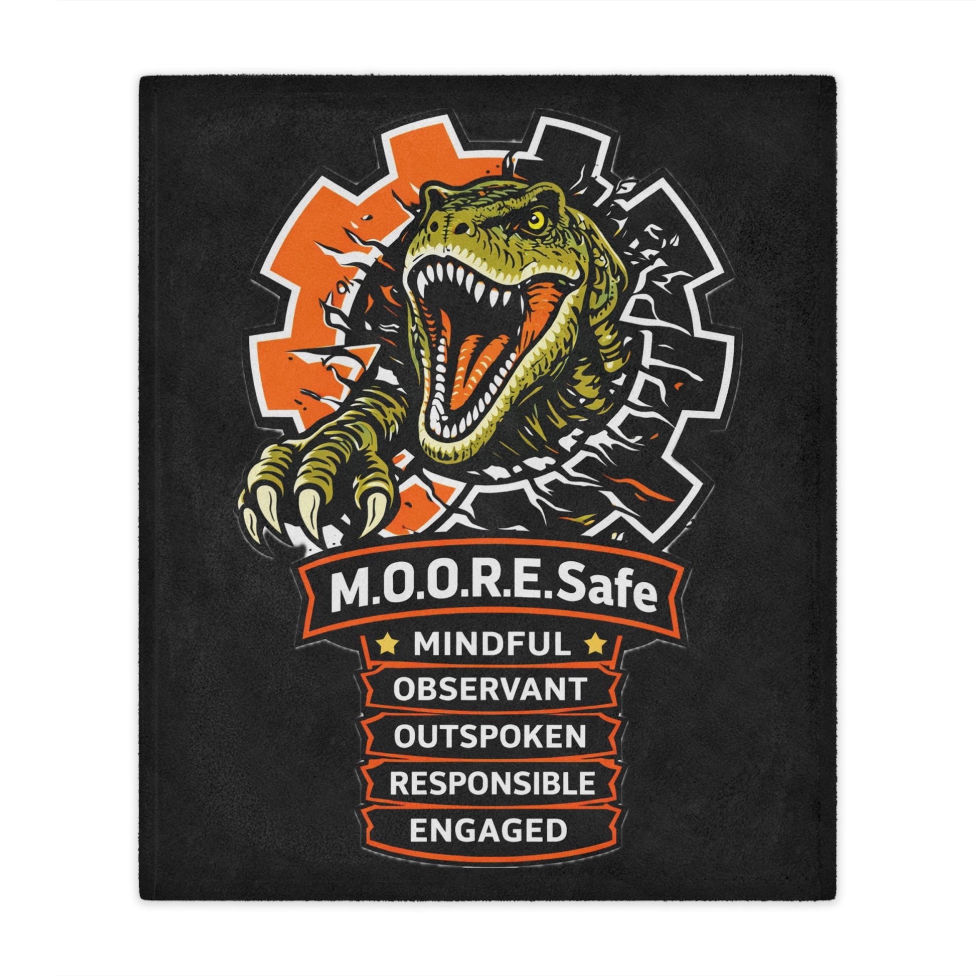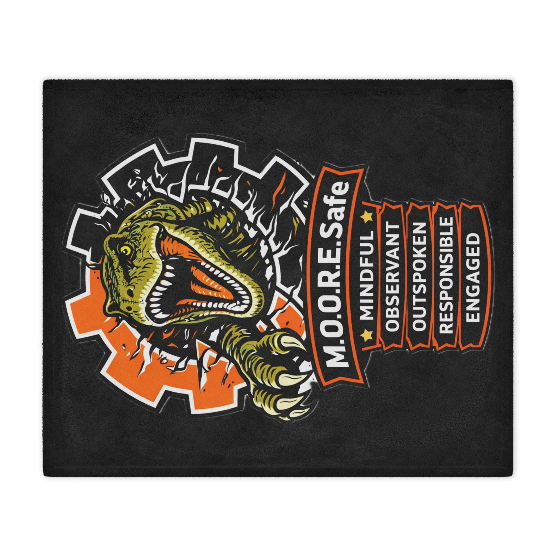 This plush Minky blanket brings bold, high-energy design to quiet moments. The roaring T-Rex bursting through industrial gears reads like a rallying cry — colors pop in vivid orange, green, and black while the distressed background keeps the look gritty and lived-in. It wraps you in a soft, velvety hug while the graphic proclaims M.O.O.R.E.Safe values: Mindful, Observant, Outspoken, Responsible, Engaged. Use it on late-night study sessions, layered on a couch for game day, or draped over a workshop chair as a nod to team safety and spirit. The one-sided print keeps the artwork bright and focused, and the finished folded edge gives the blanket a neat, durable look that holds up to everyday use.