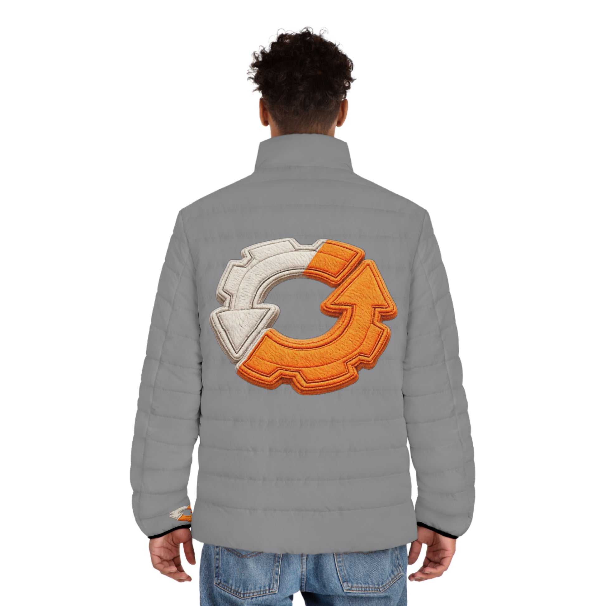 Lightweight, quilted warmth with a modern edge. This puffer jacket brings a clean, utilitarian silhouette to everyday wear — a stand-up collar and regular fit that moves easily under a backpack strap or over a sweater. Horizontal quilting keeps the insulation evenly distributed while the black cotton-like lining feels soft against the skin and absorbs moisture during brisk walks. Subtle embroidered gear-and-arrow motifs on the chest, back, and cuffs add an industrial, purpose-driven accent that reads as both sporty and intentional. Wear it on chilly commutes, weekend urban explorations, or layered for an evening around a fire; it’s made to be relied on without fuss.