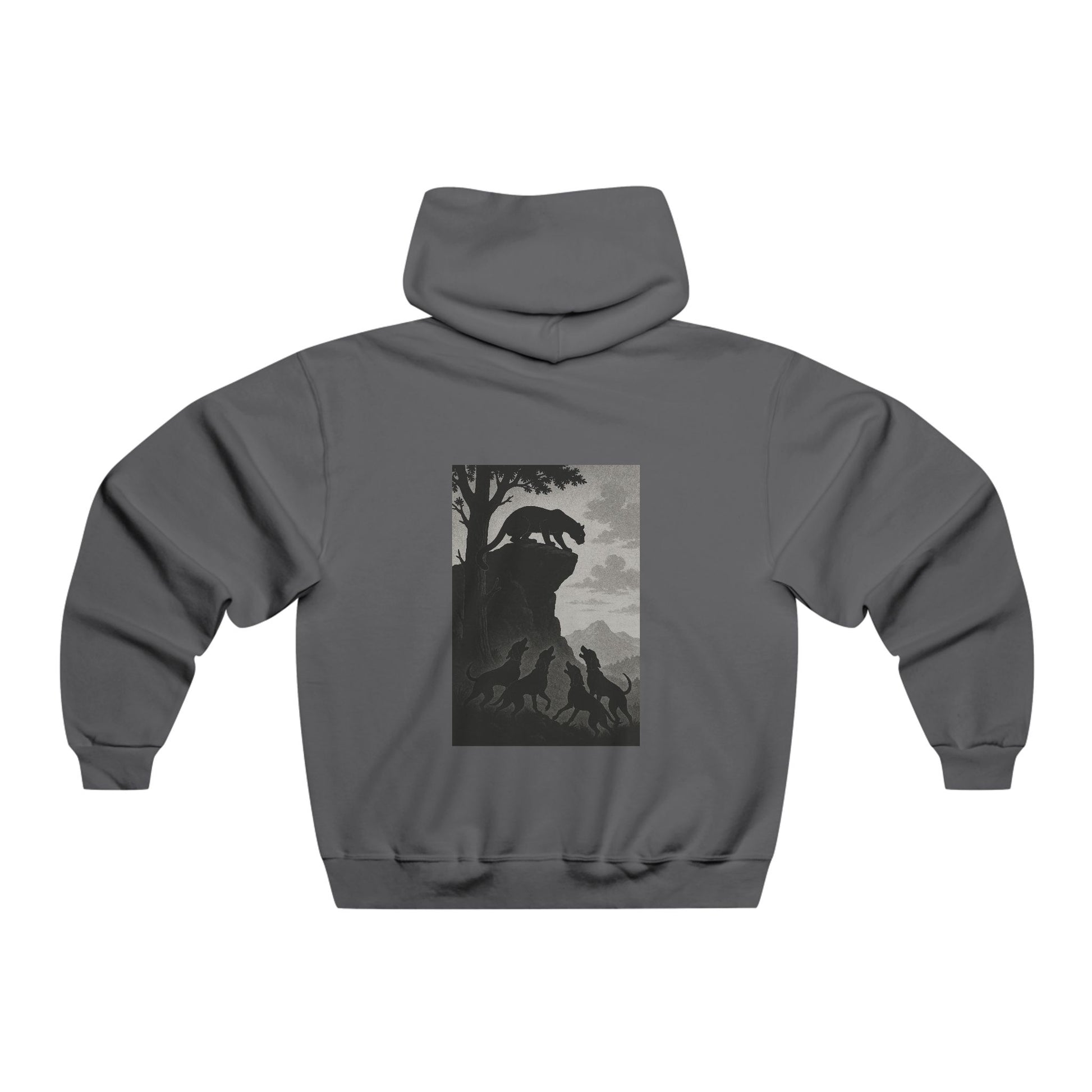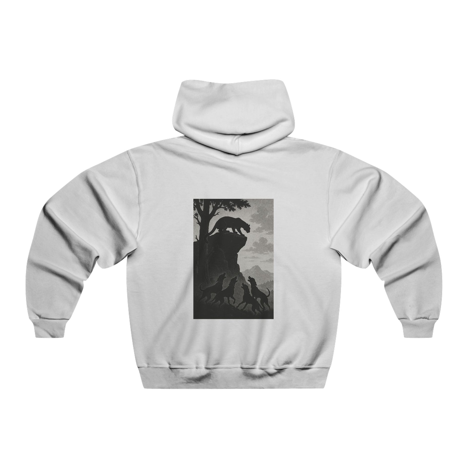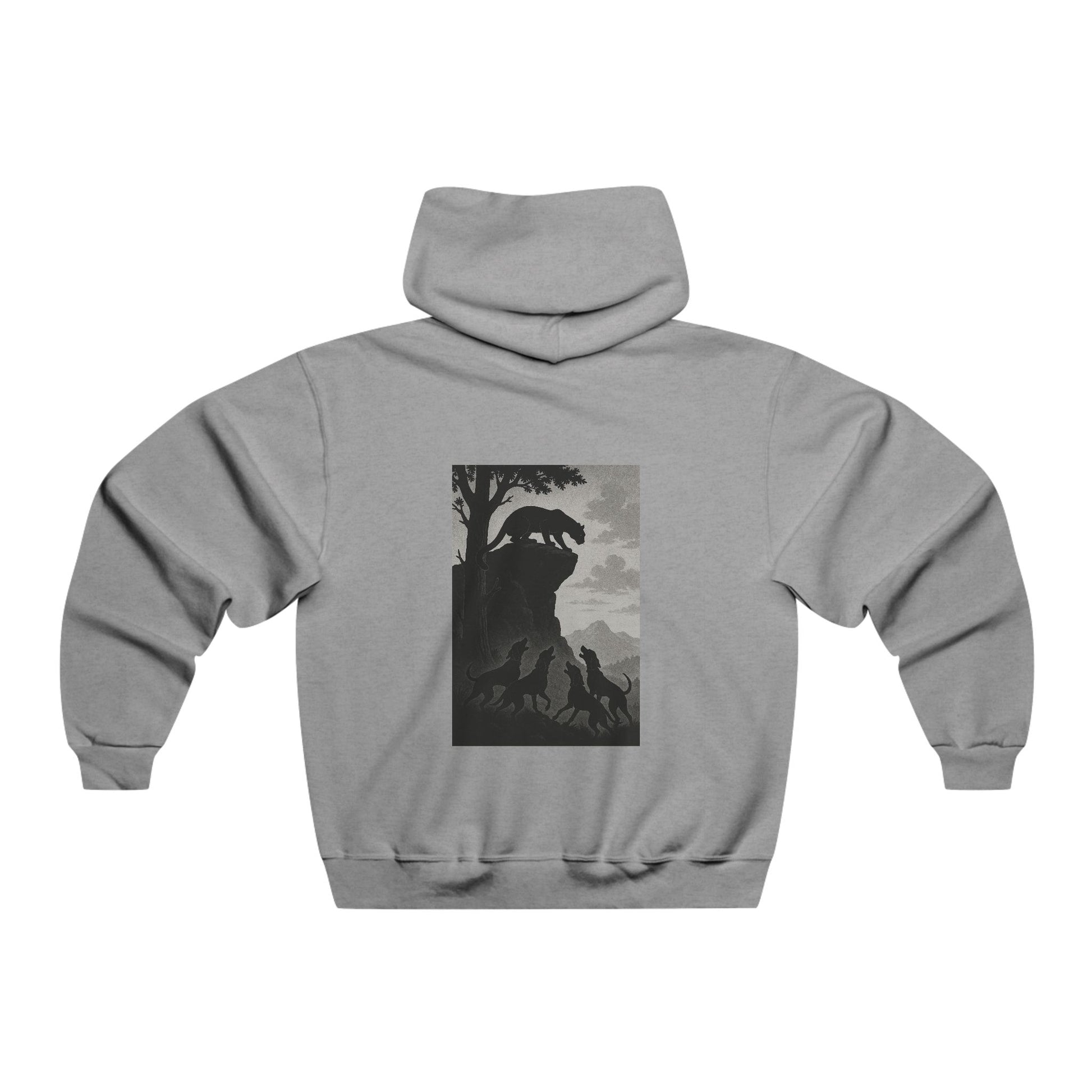 This oversized hooded sweatshirt carries a quiet, rugged energy — a soft, medium-weight shell for evenings spent around a fire or exploring backcountry roads. The front bears a small, blocky logo while the back reveals a moody, high-contrast scene: a silhouette of figures beneath a looming cliff and tree. It feels like a worn band tee for folks who prefer twilight hikes, roadside diners, and late-night storytelling. The roomy kangaroo pocket and adjustable hood keep you cozy; the loose fit layers easily over flannels and tees. Wear it to slow down, to travel light, and to carry a little mystery with you.