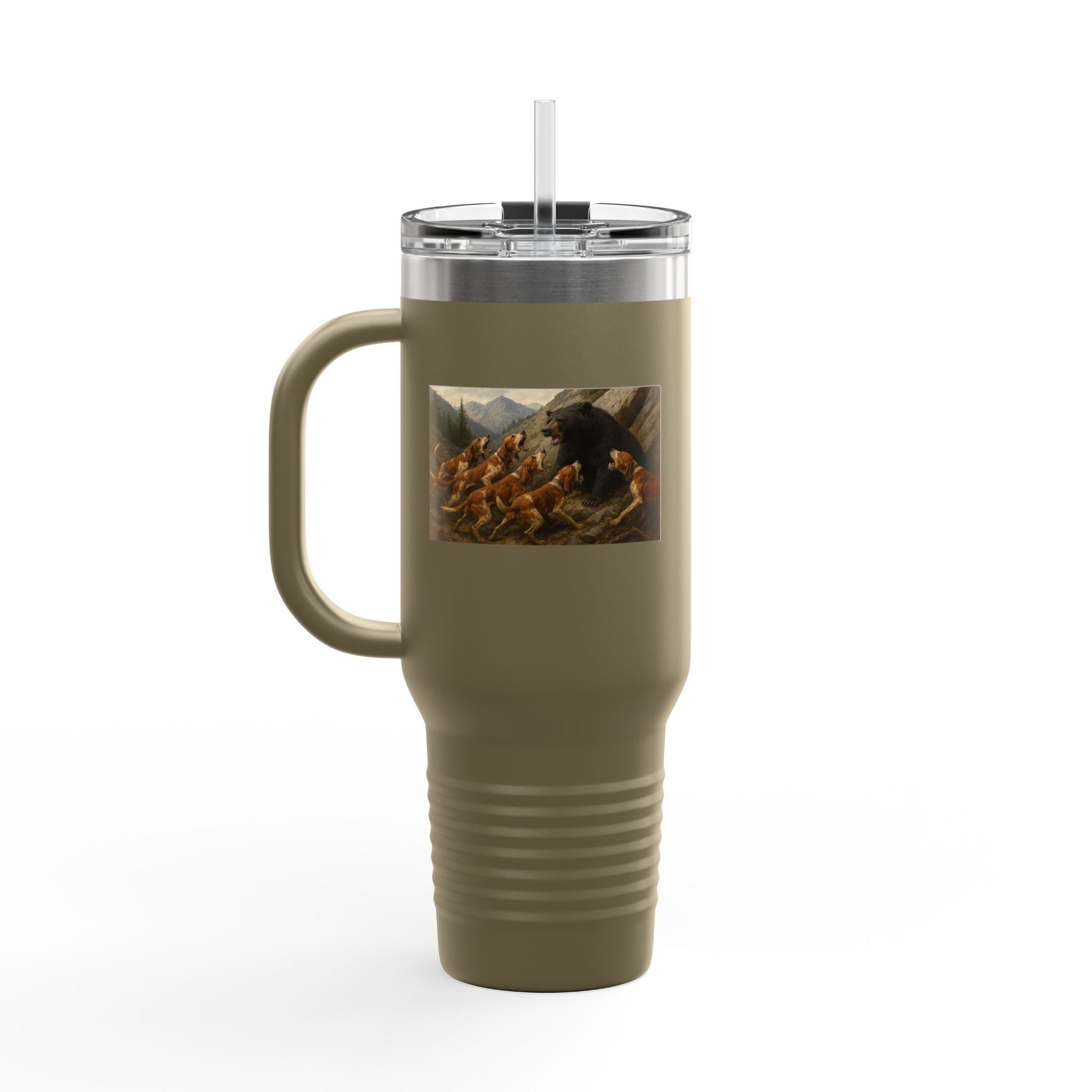 This 40oz insulated travel mug is built for long days, early starts, and the kind of people who keep moving. Thick double-wall stainless steel holds temp for hours, while the powder-coated finish gives a grippy, matte feel that won’t slip during the commute or on a dusty trail. The ergonomic handle and included straw make it easy to sip on the go, and the secure leak-proof lid stays shut when you need it to. A bold, UV-DTF printed design wraps the body for a durable, vibrant look that resists fading. Bring this mug to the office, the road, or the campsite and keep your drink exactly how you like it.