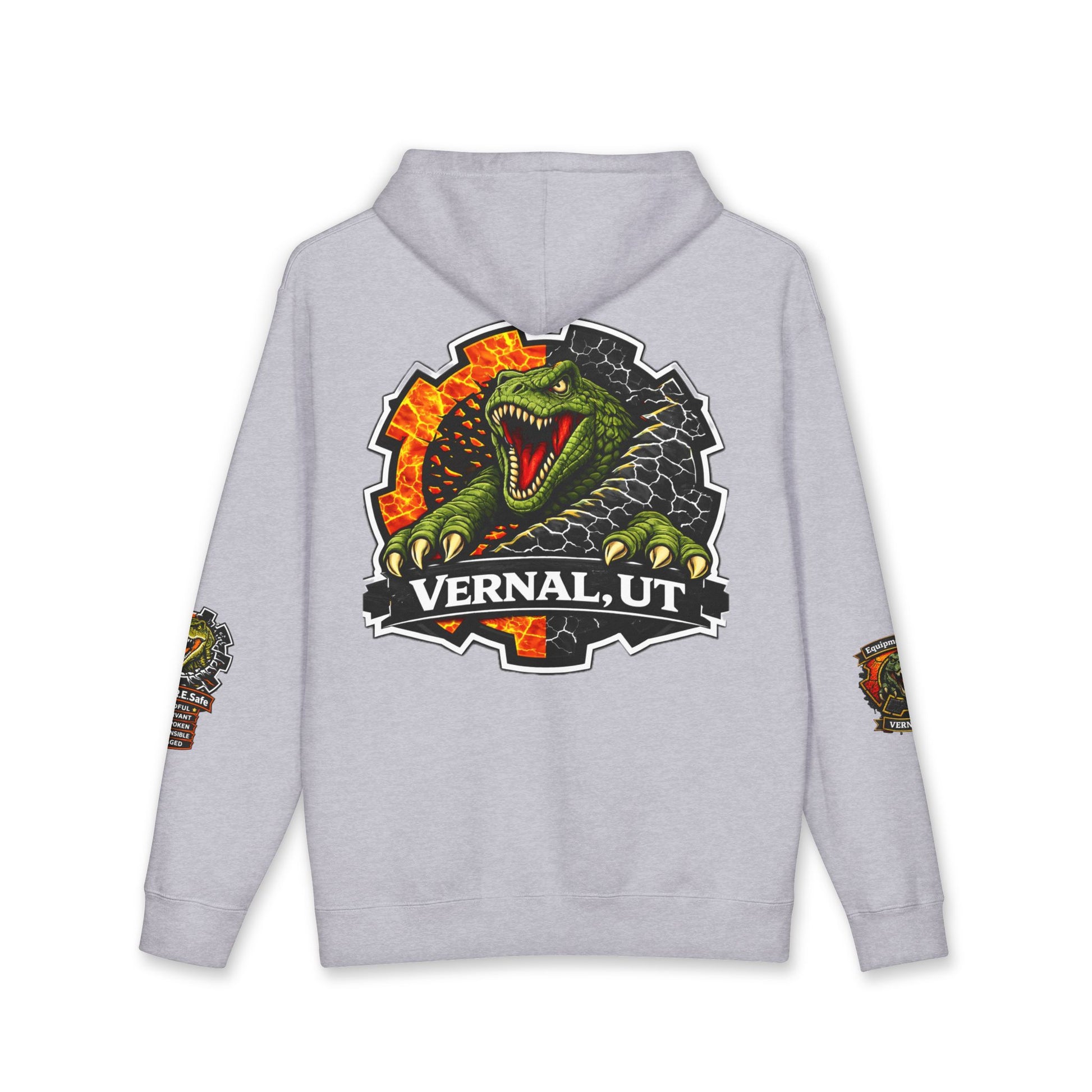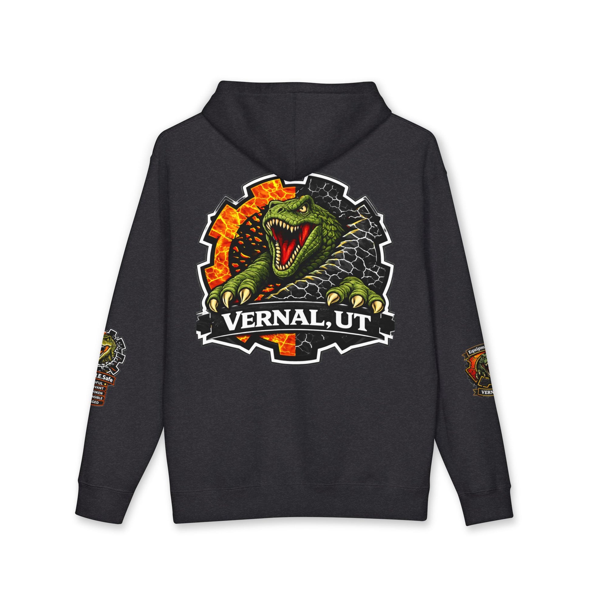 This heavyweight hoodie brings rugged warmth and bold outdoor spirit to chilly days. Thick, 10 oz fabric and a fleece-lined hood hold in heat while the relaxed cut lets you layer comfortably over tees or flannels. The graphic—featuring a fierce dinosaur crest framed by industrial gear elements and “Vernal, UT”—feels like a local badge, worn by people who chase desert canyons, off-road trails, and fossil-hunting afternoons. Small sleeve and chest graphics add character without overpowering the look. Wear it to fireside gatherings, early-morning drives, or when you want a statement piece that reads like a story about place and adventure.